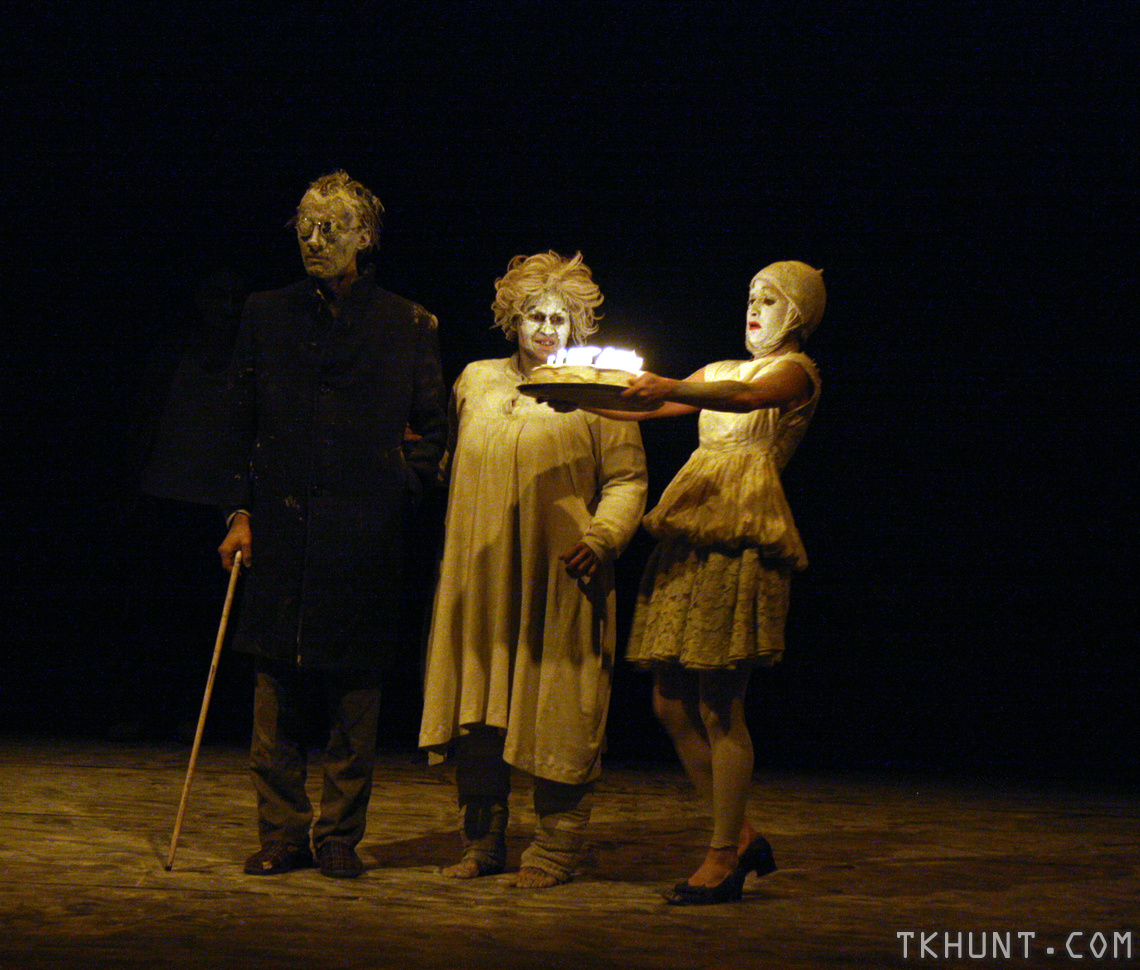 Sonra yavaş yavaş sahne aydınlanırken, ruhvari figürler belirginleşmeye ve hareket etmeye başlarlar. Kadınlı erkekli 10 grotesk figürdür bunlar. Üzerlerinde bir örnek, ten rengi uzun donlu, entarili yatak kıyafetleri vardır. Her birinin suratlarındaki bazı organlar deforme olmuştur; birinin kulakları kepçe ve büyük, diğerinin burnu uzun, diğerinin burnu kıvrık ve sivri, çoğunun dişleri dökülmüş, hepsinin saçları, üzerleri tozluydur. Akıl hastanesi sakinleri de olabilirler, berduş da, kıyametten “arta kalabilmiş” bir grup insan da, insanlığın sınırında dolaşanlar da.