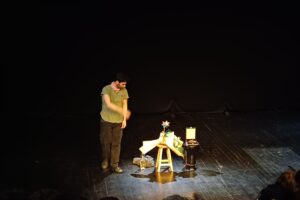 Oğulcan Arman: Mekân, daha çok dışarıda kalanların sesinin sahnede olduğu bir tiyatro. 9/8’lik Kıyamet özelinde 3 aylık bir prova süreci oldu. Metin 2024’te bitmişti fakat biz metin bittikten uzun bir süre sonra çalışmaya başladık. Çünkü sahnede bir darbukatör olması gerekiyordu, benim de darbukaya çalışmam lazımdı. 2024’te prömiyer yaptık ancak öncesinde neredeyse bir sene çalışamadık. Şamil metne tekrar baktı, Sezen rejiye dair çalışmalar yaptı. Darbuka sahneye adapte edilebilir hale geldiğinde provalara başladık. 3 aylık bir prova süreciydi; Sezen, ben ve Merve Ülgentay birlikte çalıştık.