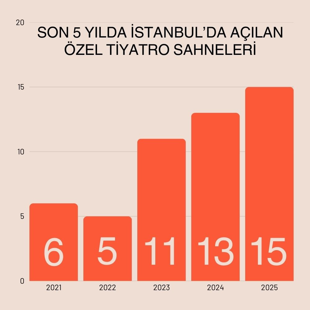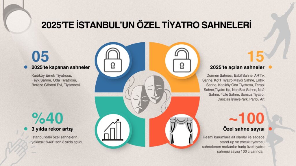 Aynı zamanda 2025, yeni açılan bağımsız tiyatro sahneleri açısından en bereketli yıllardan biri oldu. Maltepe’de Dormen Sahnesi ve Babil Sahne, Ümraniye’de ART’ık Sahne, Kadıköy’de Kot1 Tiyatro, Mayor Sahne, Entrik Sahne, Kino Vertov (Kadıköy Oda Tiyatrosu), Terapi Sahne ve Tiyatro Ka, “Biz de varız” diyerek kapılarını açtı. Beyoğlu’ndaki Non Box da 2025’te izleyici ağırlamaya başlayan sahnelerden oldu. Daha önce atölye çalışmaları yürütülen Kadıköy No2 Sahne (Baysan Pamay Salonu) ile Maltepe’deki 4Life perdelerini izleyicilere açtı. Şişli’de kapanan Oda Tiyatrosu’nun yerine aynı mekânda Sonsuz Tiyatro açıldı. Entrik Sahne bazı sorunlar nedeniyle şimdilik faaliyetini durdursa da, yeni yer arayışı devam ediyor.