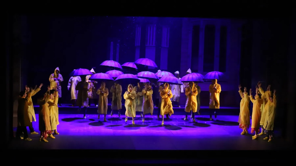 Teknik ekibin kurdukları sistemle sahnede yağmur yağdırma görüntüsü oluşturduğu ilgi çekici eserde, orkestra, sahne üstündeki sanatçılar ve teknik personel dahil 160 kişi görev alıyor.