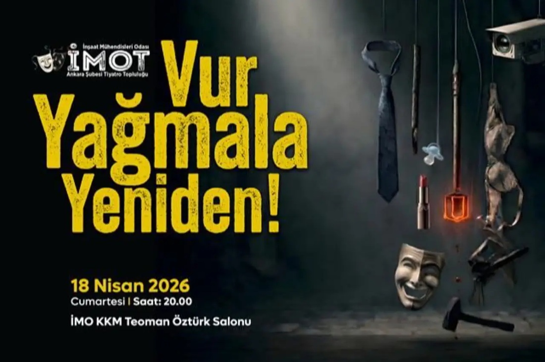 İnşaat Mühendisleri Odası Ankara Şubesi Tiyatro Topluluğu (İMOT), 18 Nisan Cumartesi günü saat 20.00’de İMO KKM Salonu’nda 15. yeni oyunu “Vur/Yağmala/Yeniden” ile seyirci karşısına çıkacağını duyurdu.
