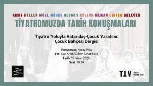 Tiyatromuzda Tarih Konuşmaları dizisinin XXXI. oturumu, Neray Pala’nın “Tiyatro Yoluyla Vatandaş-Çocuk Yaratımı: Çocuk Bahçesi Dergisi” başlıklı konuşmasıyla, 15 Nisan Çarşamba günü saat 18.30’da Yapı Kredi Kültür Sanat Loca’da gerçekleşecektir.