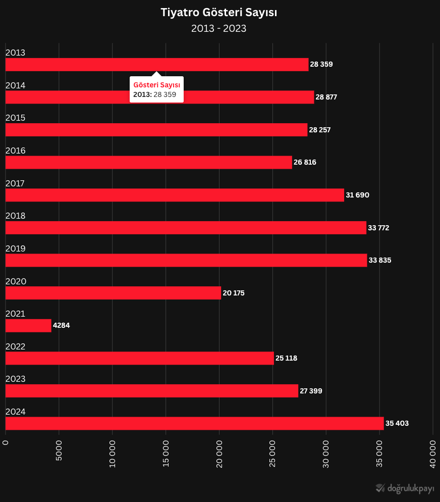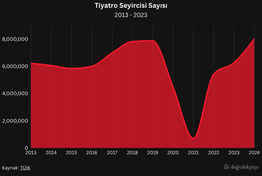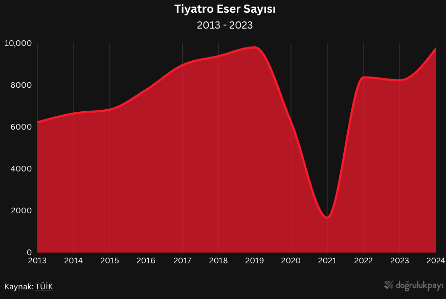 Tiyatronun seyrini anlamak için elimizde veriler de var. TÜİK, tiyatro ve sinema gibi sanat dallarına dair düzenli olarak istatistikler yayımlıyor. TÜİK’in kullandığı tiyatro tanımı şu şekilde: